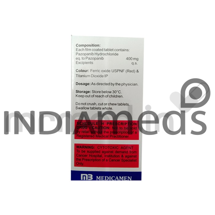 Pazocam 400mg tablet is used to treat certain types of cancer (kidney, soft tissue sarcoma). It decreases the blood supply to the cancer tumor to slow tumor growth.